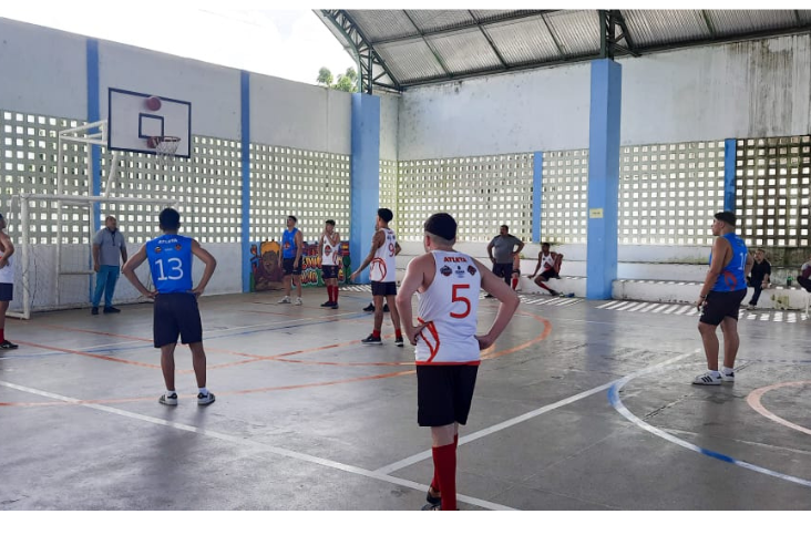 Bola girando no centro socioeducativo Dom Bosco em mais disputas do campeonato de basquete, Projeto “Cesta de 4 pontos”, na última sexta (28). Atletas dos centros Dom Bosco, Patativa do Assaré, São Francisco e Canindezinho participaram do penúltimo dia de competição, que foi organizada pelo eixo de cultura, esporte e lazer da Superintendência do Sistema Estadual de Atendimento Socioeducativo (Seas)