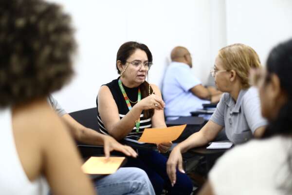 Na sequência, foi realizada a atividade formativa Troca de Saberes, voltada a servidores do CSABM e a profissionais do POC. A ação integra o processo de diagnóstico institucional por meio da escuta qualificada e da troca de experiências, incluindo visita técnica à unidade feminina do CSABM, com possibilidade de escuta das jovens, além de visitas aos pontos de atendimento do Projeto Novas Trilhas, responsável pelo acompanhamento multiprofissional de jovens no pós-medida.
